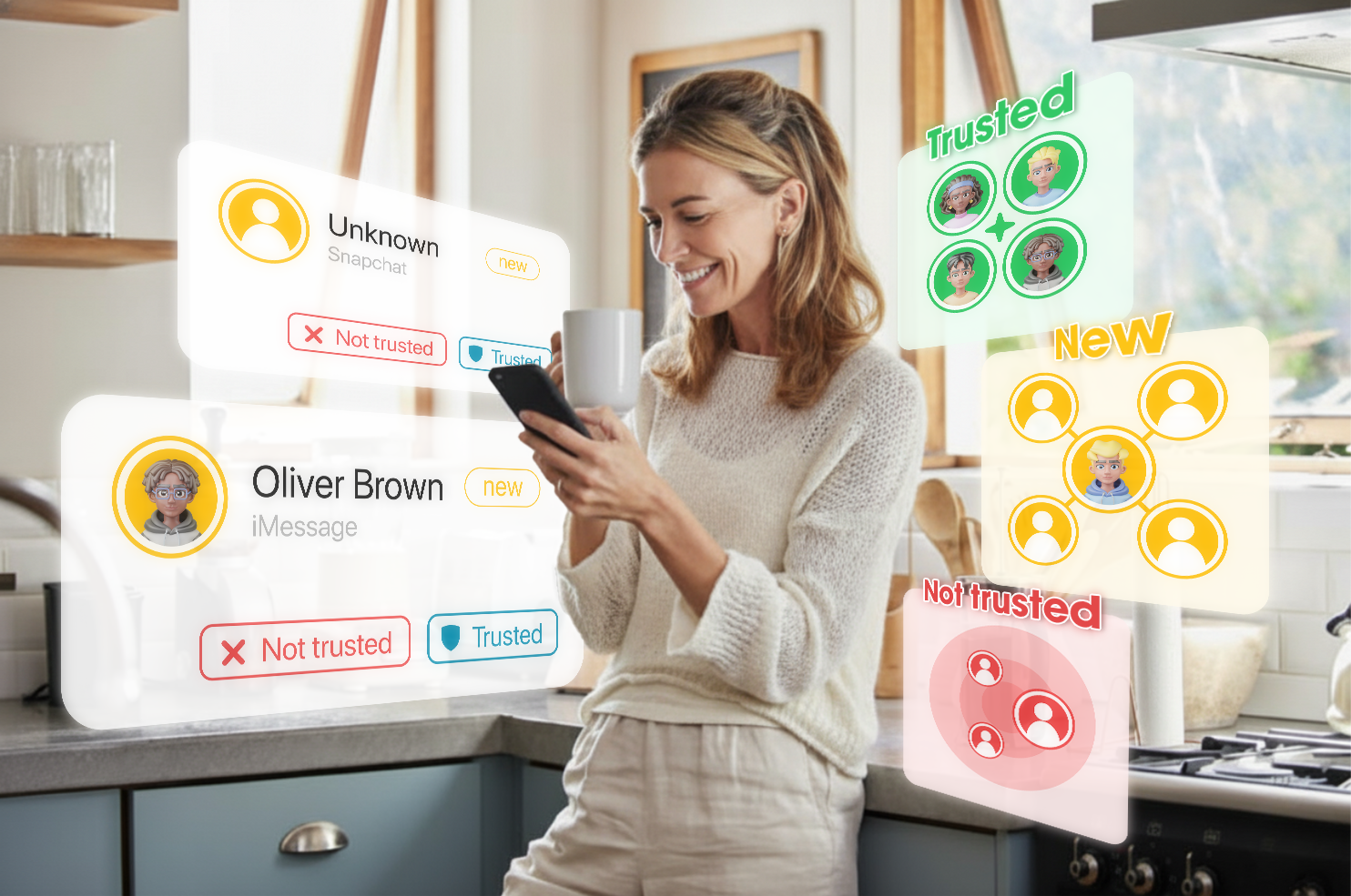 Then we added Contact verification. Joey highlights new or unknown contacts and gives you a simple workflow to verify them-add context (for example, "Billy H., science class, sits next to Finn"), set trust, or review flags.